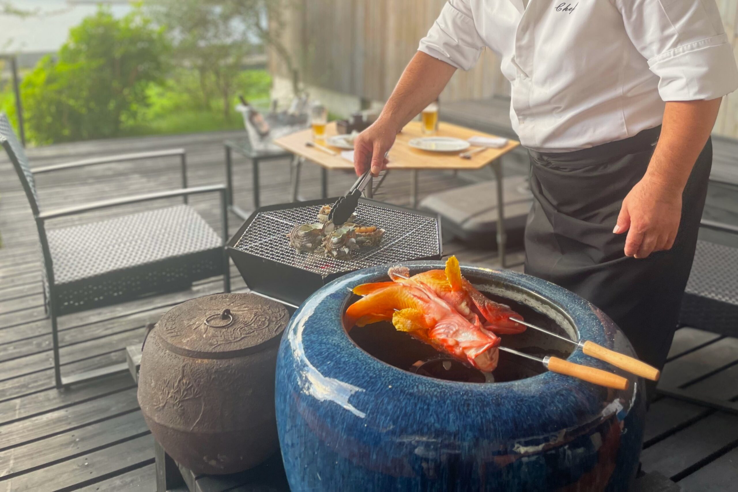 本プランでは、壱岐牛や旬の魚介、壱岐産の春野菜を中心とした会席コースを、ガーデンテラスに備えた炭火で仕上げるスタイルでご提供します。屋外でありながら、料理長監修の会席コースを味わえるのが特徴です。